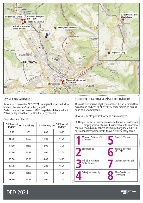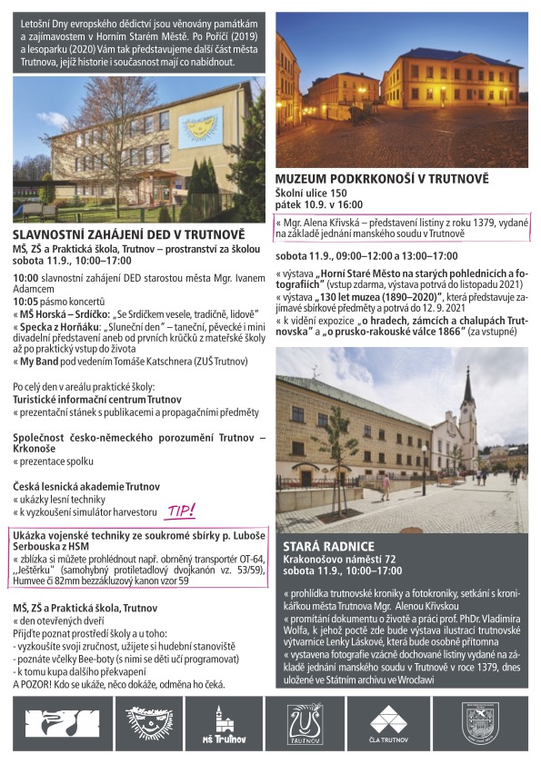 V sobotu 11.září 2021 se v Trutnově konají tradiční dny evropského kulturního dědictví. Tentokrát budou věnovány především Hornímu Starému Městu a Babí.